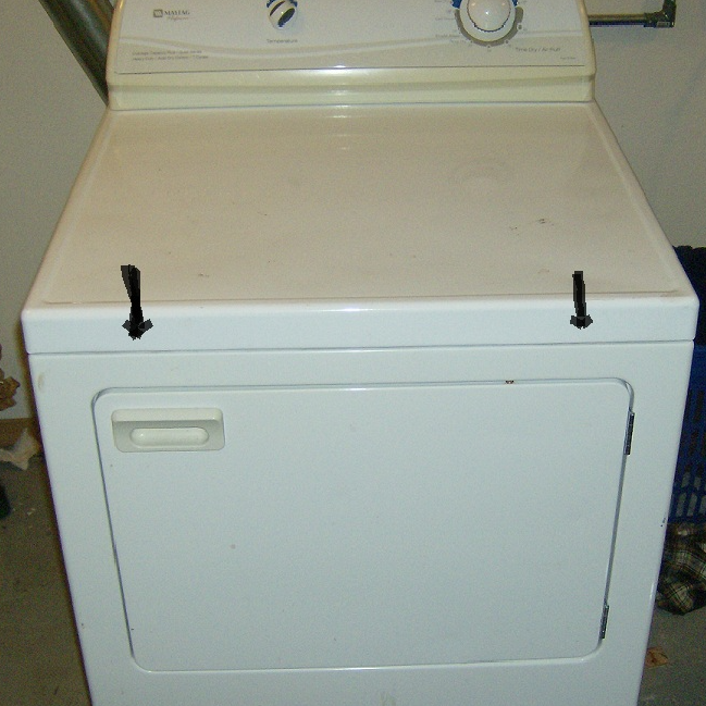 For this demonstration, I will be using a Maytag performa dryer. This machine is easy to work on, and you only need a 5/16th nut driver. I have one that is a screwdriver hand tool. A butter knife or flat spatula applicator also for pressing on clip springs. First, slide your butter knife in the crease approximately at locations shown in photo. This will allow you to flip the lid up, and lean it against the wall. Be careful the lid doesn't slide up and off the hinge at back. Now, you can access the sheet metal type screws on top inside corners of cabinet. Remove these, and tip front of cabinet forward and up off the lower slots in base.