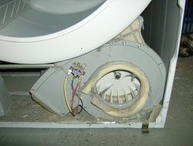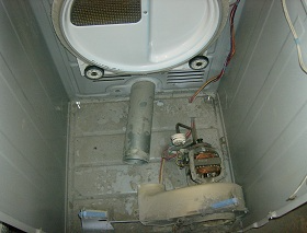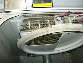 As you can see, between some of the pics where it was really dirty and how clean it is afterwards, this will help the efficiency of the machine. Pay close attention to lint trap and duct leading up to blower fan. Check condition of fan and the padding that seals it up. Also, check the heat element coils behind the heat vent. Check to see if any lint is trapped near it that could possibly be a fire hazard, and clean area. Check your coils for broken sections or loose hanging sections. This is a bad element, replace.