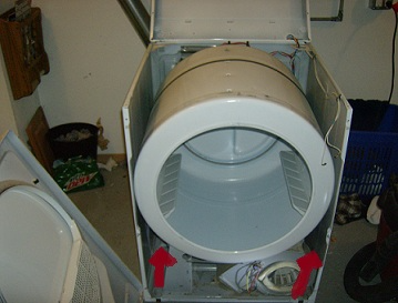 Once you have the front off the machine off, the drum can be removed. Depending on the model you have in your home, the belt needs to be loosened. Reach your arms into the spaces below the drum, and feel for the belt. Follow this to the idler puller gear. Push or pull the puller gear to the side, and unhook the belt. Now, the tub can be slid towards the front of the machine and off of the rear rollers. Take note of the padding in the tracks by making sure they it stays in place during removal and at the time of reinstallation.